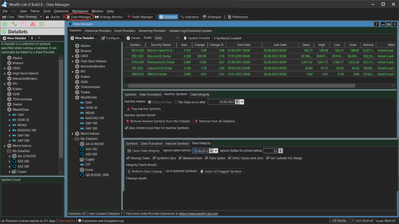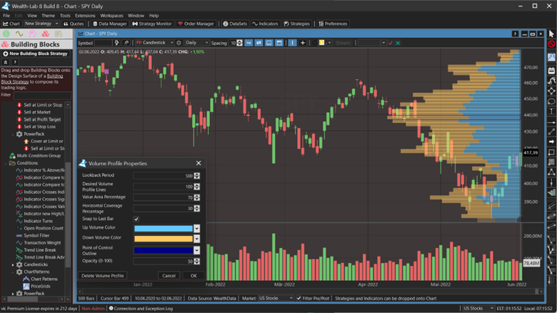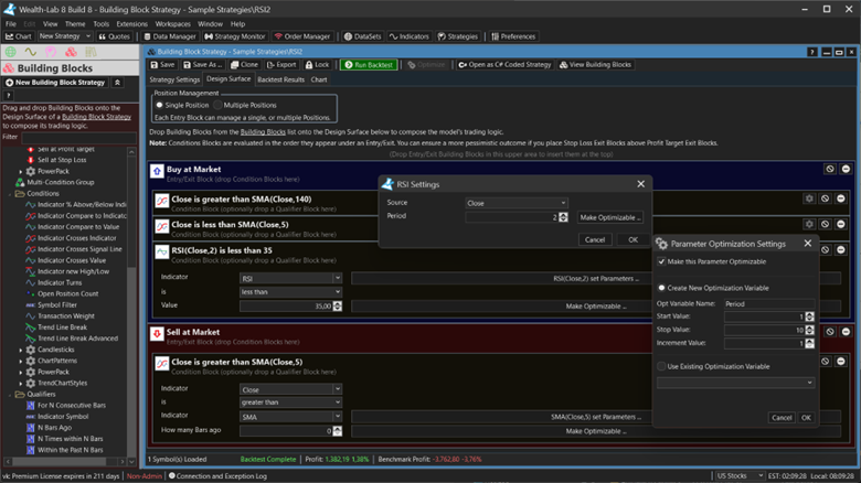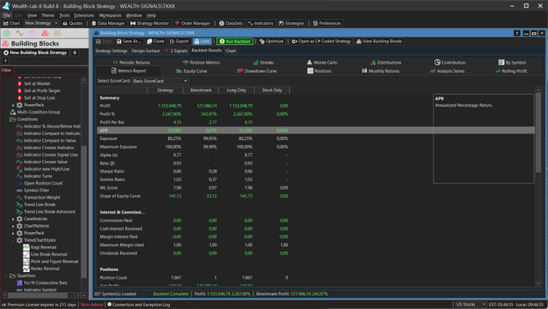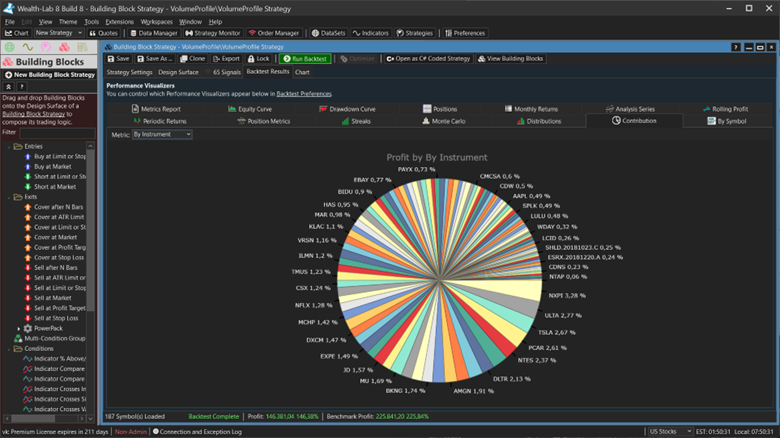 WealthLab is a platform for developing, testing, and trading automated strategies. Users can create trading strategies using simple drag and drop blocks, or by programming C# code. It includes historical data for US and German markets that promote backtesting without survivorship bias.
